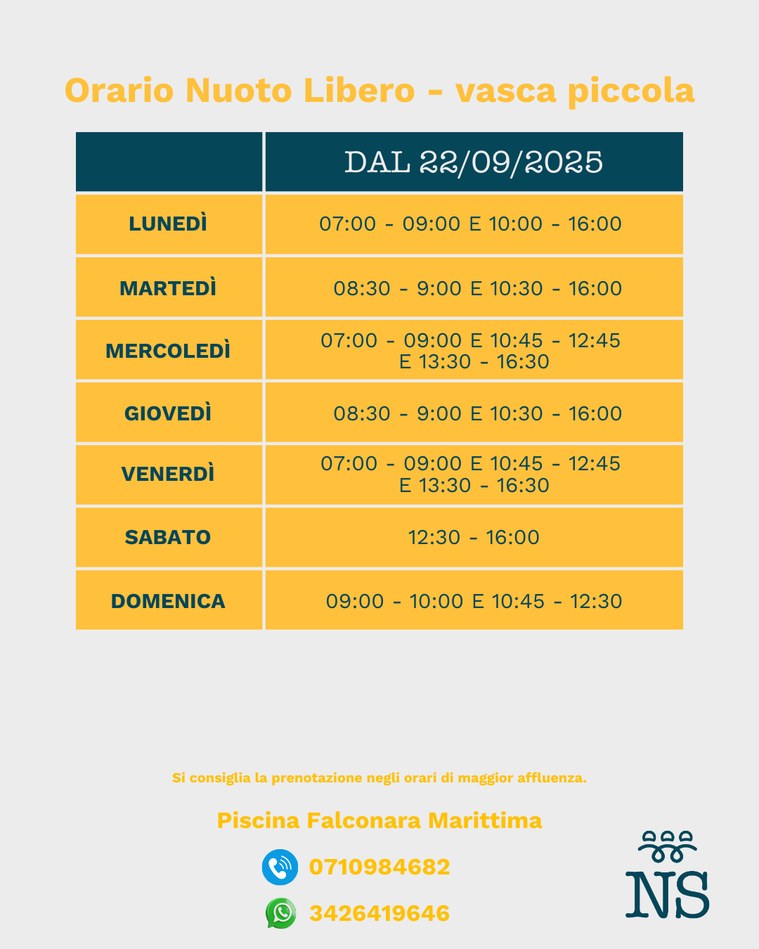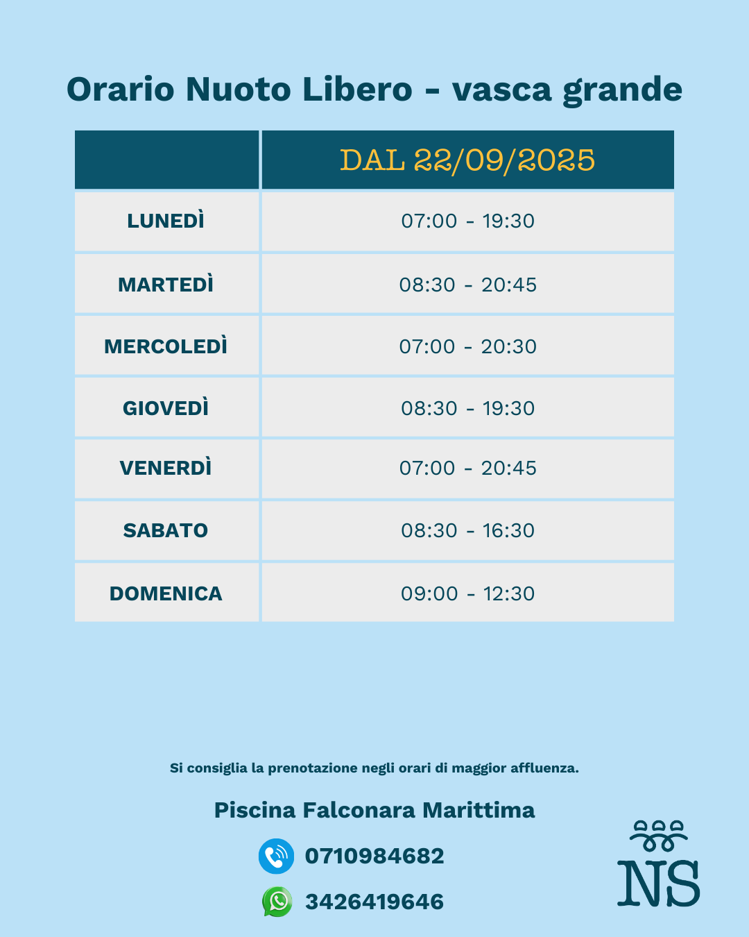 Nuoto libero presente in tutti gli orari di apertura. Sempre a disposizione corsie, tavolette e pull boy. Sono a disposizione anche la vasca piccola negli orari indicati.