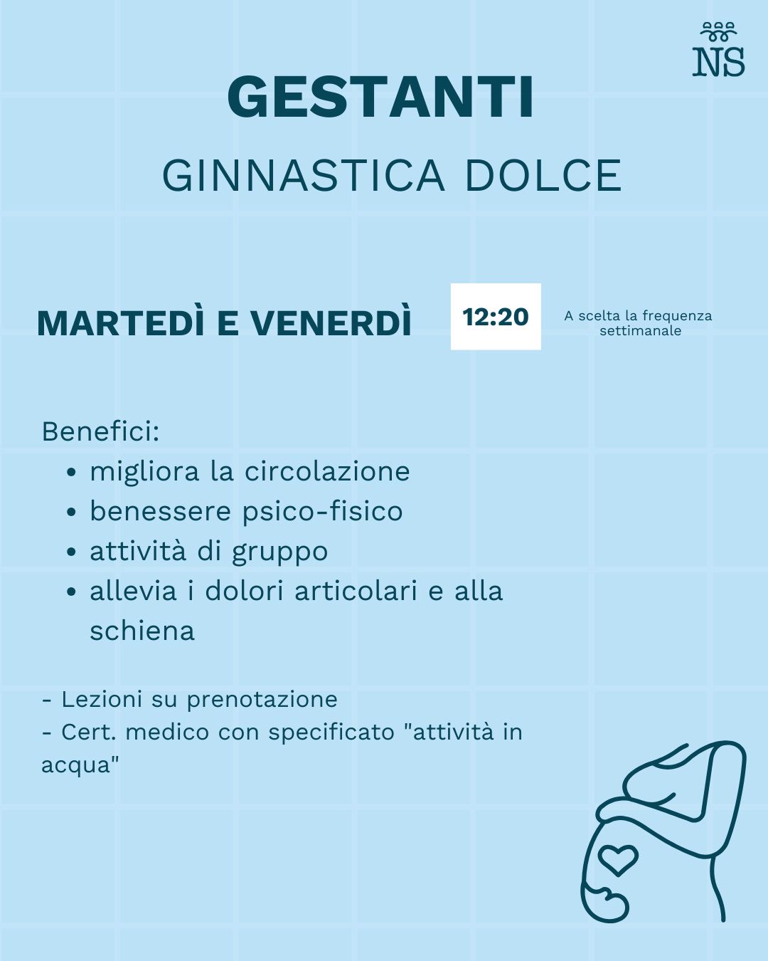 E’ obbligatorio presentare già dalla prima lezione il certificato medico del ginecologo con la specifica di poter svolgere attività in acqua.