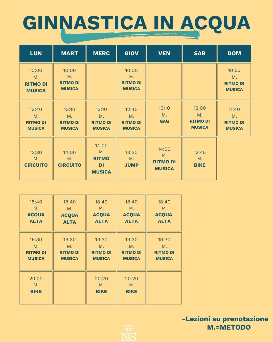 Le iscrizioni sono a pacchetti con ingressi su prenotazione, in modo da non essere vincolati a giorni e orari prestabiliti, ma si possono frequentare in base alle proprie esigenze e preferenza di lezione: tra i metodi proposti Ginnastica in Acqua a ritmo di musica, Jump, Acquabike, Acqua Alta, Total Body e molte altre metodologie!