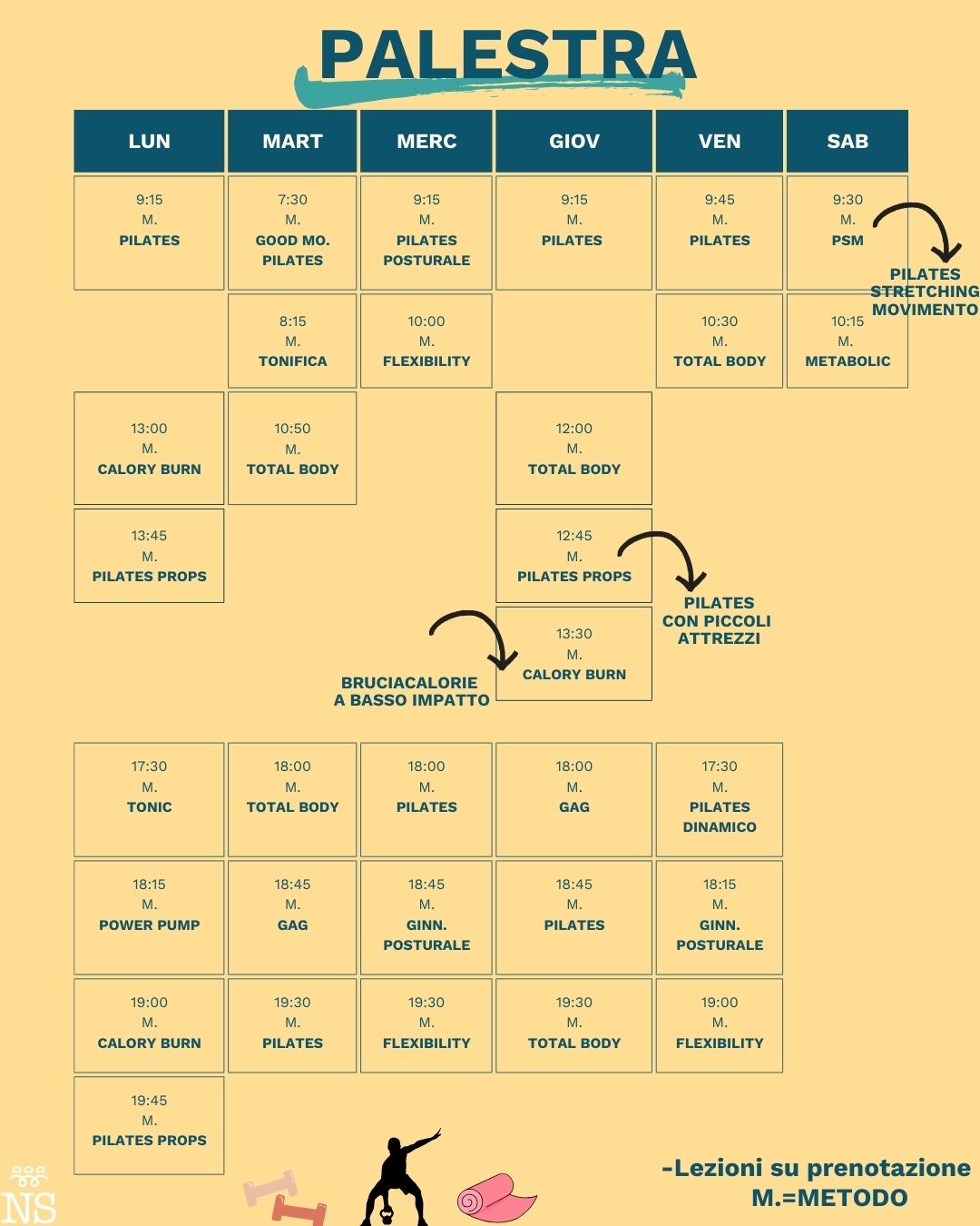 • Palestra: utilizzata per attività corsistiche con i nostri tecnici oppure, per chi volesse allenamenti personalizzati, sedute con i nostri Personal Trainer. Gli allenamenti funzionali proposti mirano allo sviluppo di forza, equilibrio, flessibilità e stabilità della parte centrale del corpo.