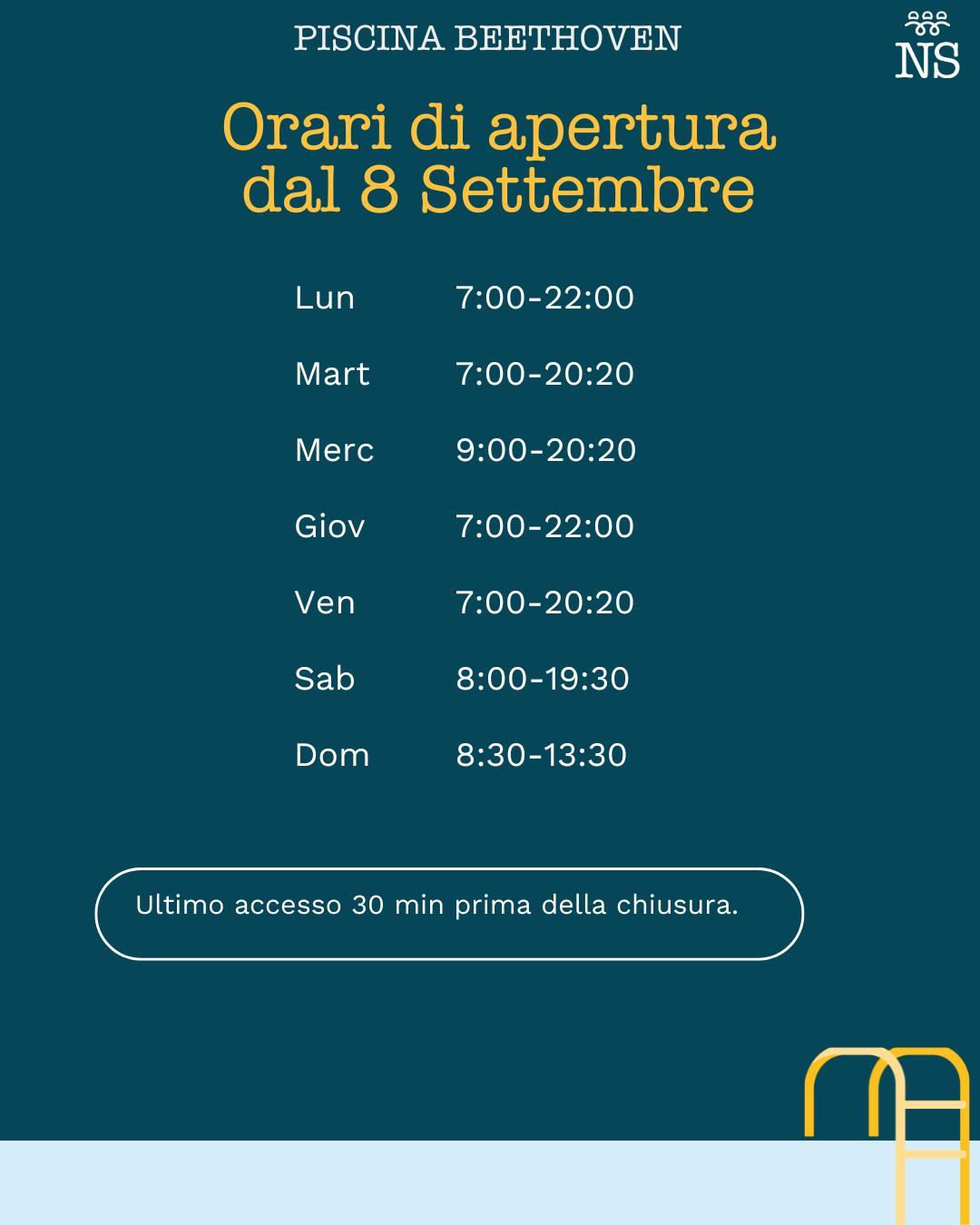 L’impianto chiude 30 minuti dopo l’orario di fine del nuoto libero
